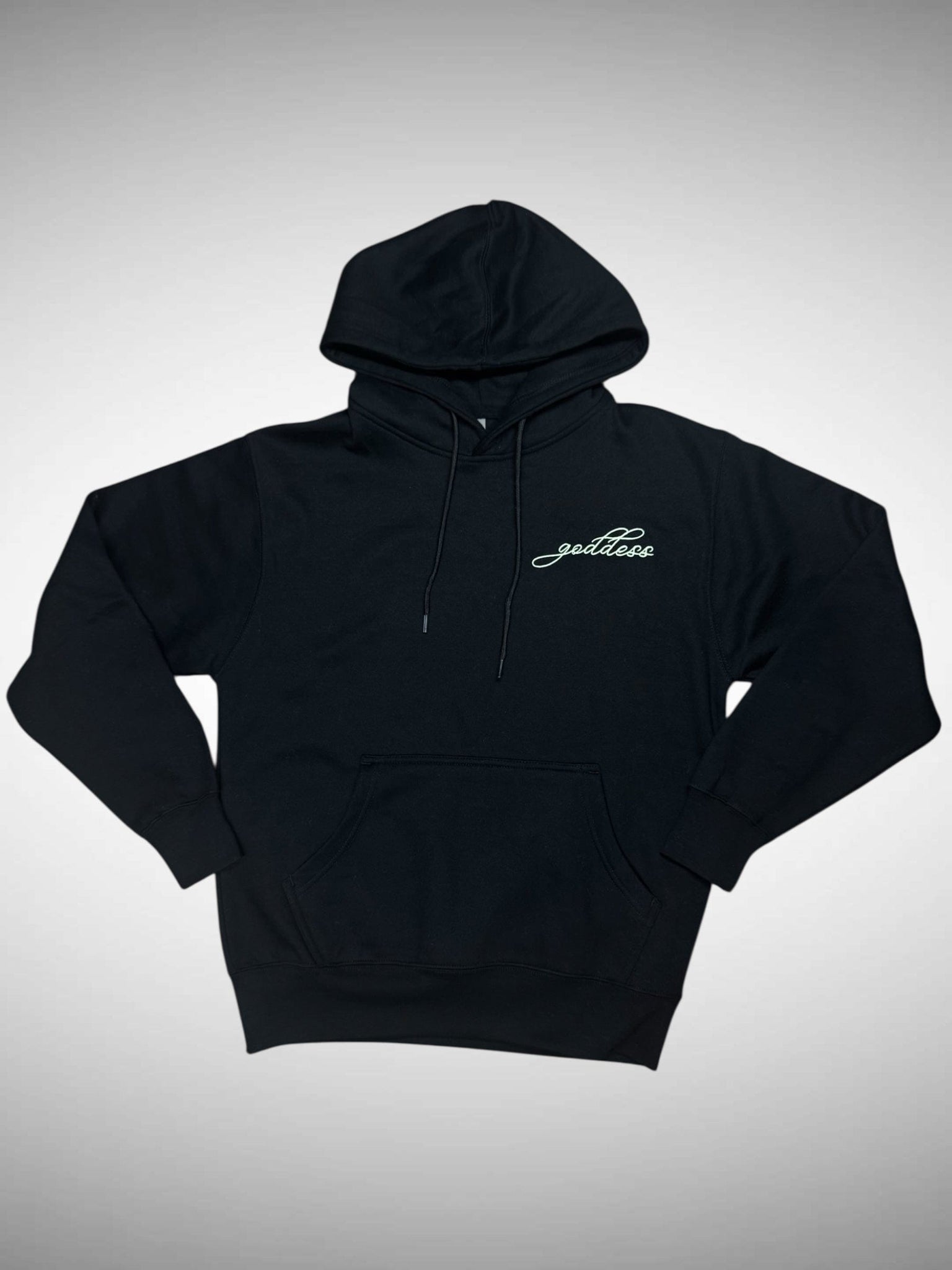 Step into your power with a layer that feels as good as it looks. This sleek, black hoodie is more than just a staple - it's a statement. Featuring a refined, embroidered, light green "goddess" script on the left chest, it combines minimalist streetwear aesthetics with high-end comfort.