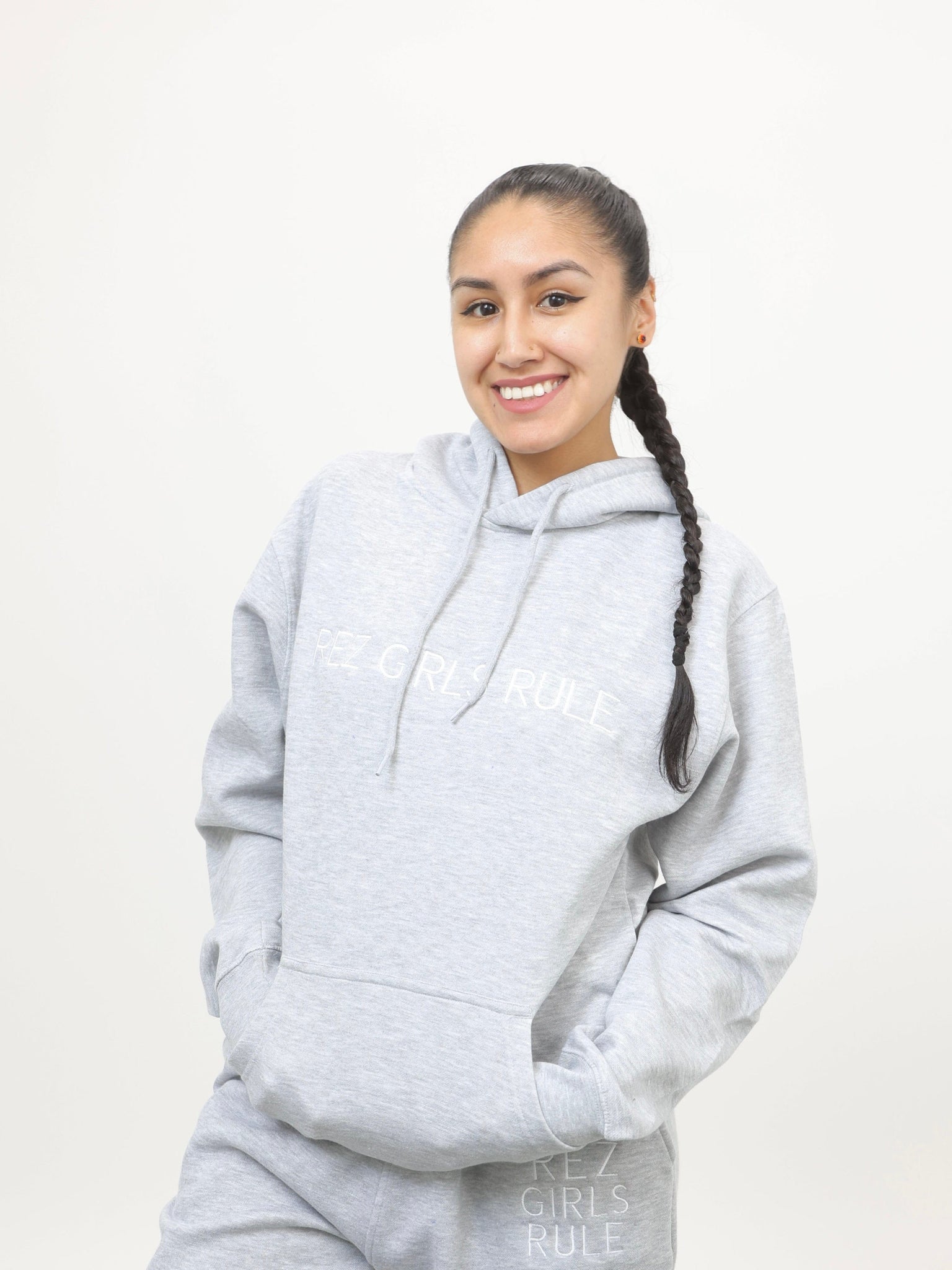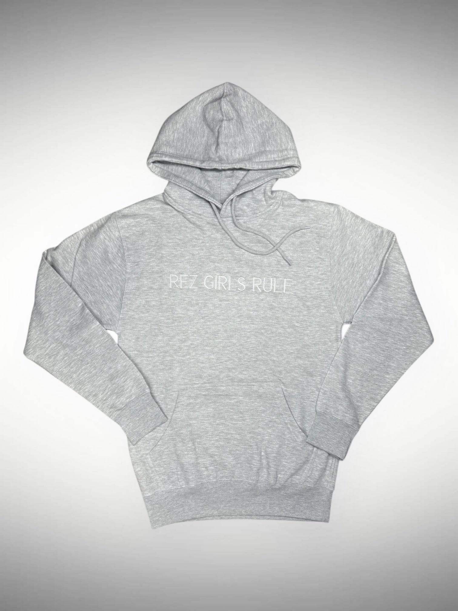 Wear your pride with a classic, cozy staple that makes a statement. This heather grey hoodie features the empowering "Rez Girls Rule" text in a clean, white, embroidered, minimalist font across the chest. It's a perfect blend of meaningful design and high-quality construction.